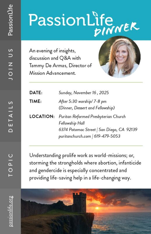 PassionLife works as a prolife global missions partner to missionaries and indigenous Christian leaders, where the plague of abortion, infanticide and gendercide is especially concentrated. In such places we disciple people in a biblical worldview of human value, teach them how to make the case for life in a secular culture, see abortion guilt and grief as an entry point for the Gospel’s offer of forgiveness and freedom, and provide models of pregnancy crisis intervention services that they can adapt to their culture and neighborhood. For more information, visit passionlife.org.